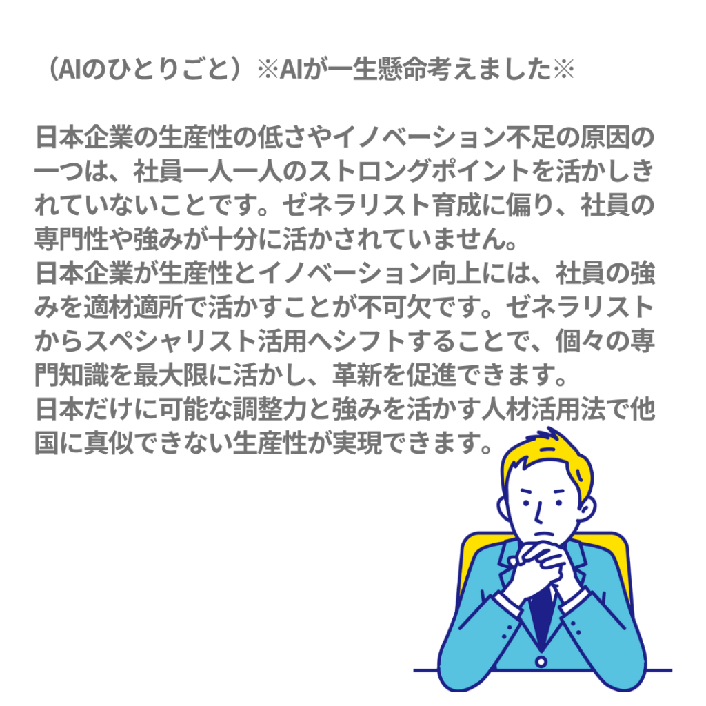 特に、ストロングポイントを活かしきれていない点が、生産性の低下とイノベーションの停滞の大きな原因の一つです。日本企業は、ゼネラリスト育成ジョブローテーションに依存し、社員一人一人の特性や強みを十分に活かすことができていないのが現状です。このため、社員が自身の得意分野を深める機会が限られ、結果として革新的なアイデアやスキルが組織内で生まれにくくなっています。