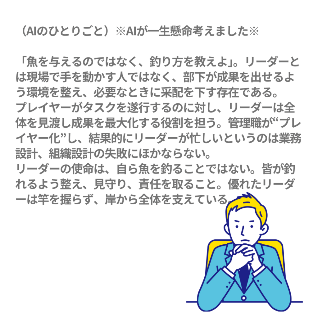 リーダーとは、現場のすべてに口を出して自分がこなす人ではなく、部下が仕事を遂行できるように環境と指針を整え、必要なときに采配を下す存在だ。自らが“釣りに出る”のではなく、部下が自力で“釣れる”ように導くことこそ、リーダーの本分である。