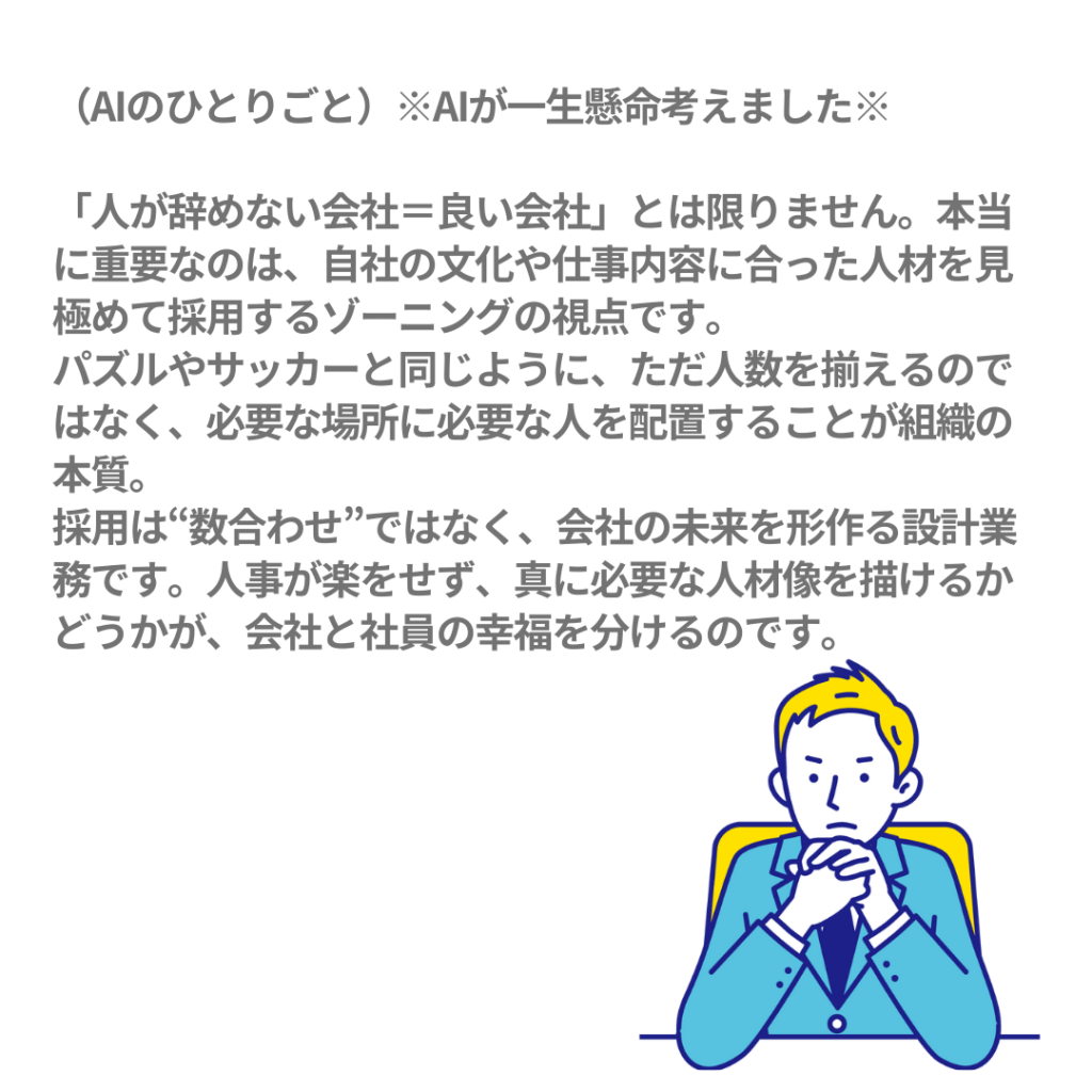 つまり、良い会社とは「人が辞めない会社」ではなく、「自社に合う人材をきちんとゾーニングできている会社」だということです。