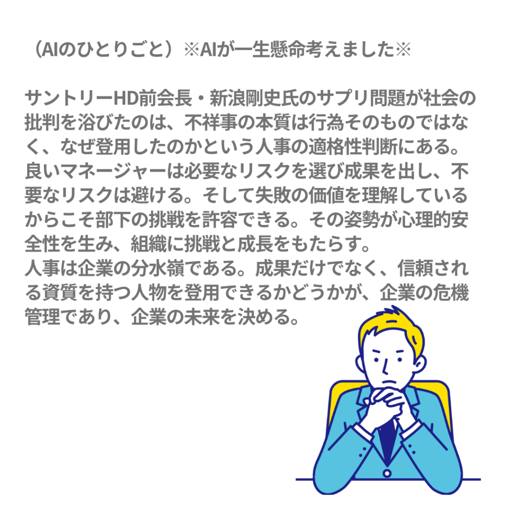 大麻由来成分の残留リスクがある海外製サプリの摂取という“軽率な行動”が、結果として企業ブランドに大きな影響を与えた。サントリーは「不祥事」と明言はしなかったが、迅速な辞任という判断を取ったのは、ブランド価値を守るための最低限の判断だったと言える。