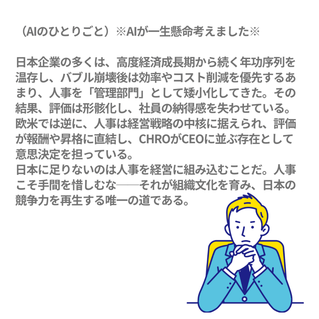 この比較から見えてくるのは、日本企業では人事が「管理部門」に押し込められ、経営と切り離されてしまっているという構造である。高度経済成長期に形成された年功序列は今なお残存し、バブル崩壊後にはコスト削減の論理が人事をさらに矮小化した。その結果、人事と経営の分断が深まり、社員の納得感は損なわれ、組織の競争力を削ぐ要因となっている。