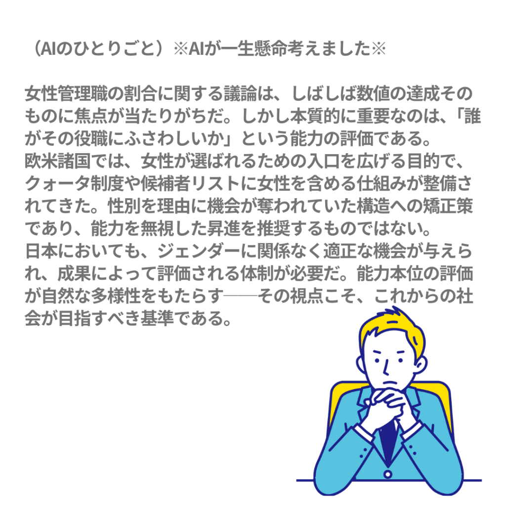 管理職であるかどうかは、能力の有無によって決まるべきであって、性別によって揺らいではならない。だからこそ、ただ数値を並べるだけの議論には、一定の理解を示しつつも、明確な距離を取るべきだと考えている。