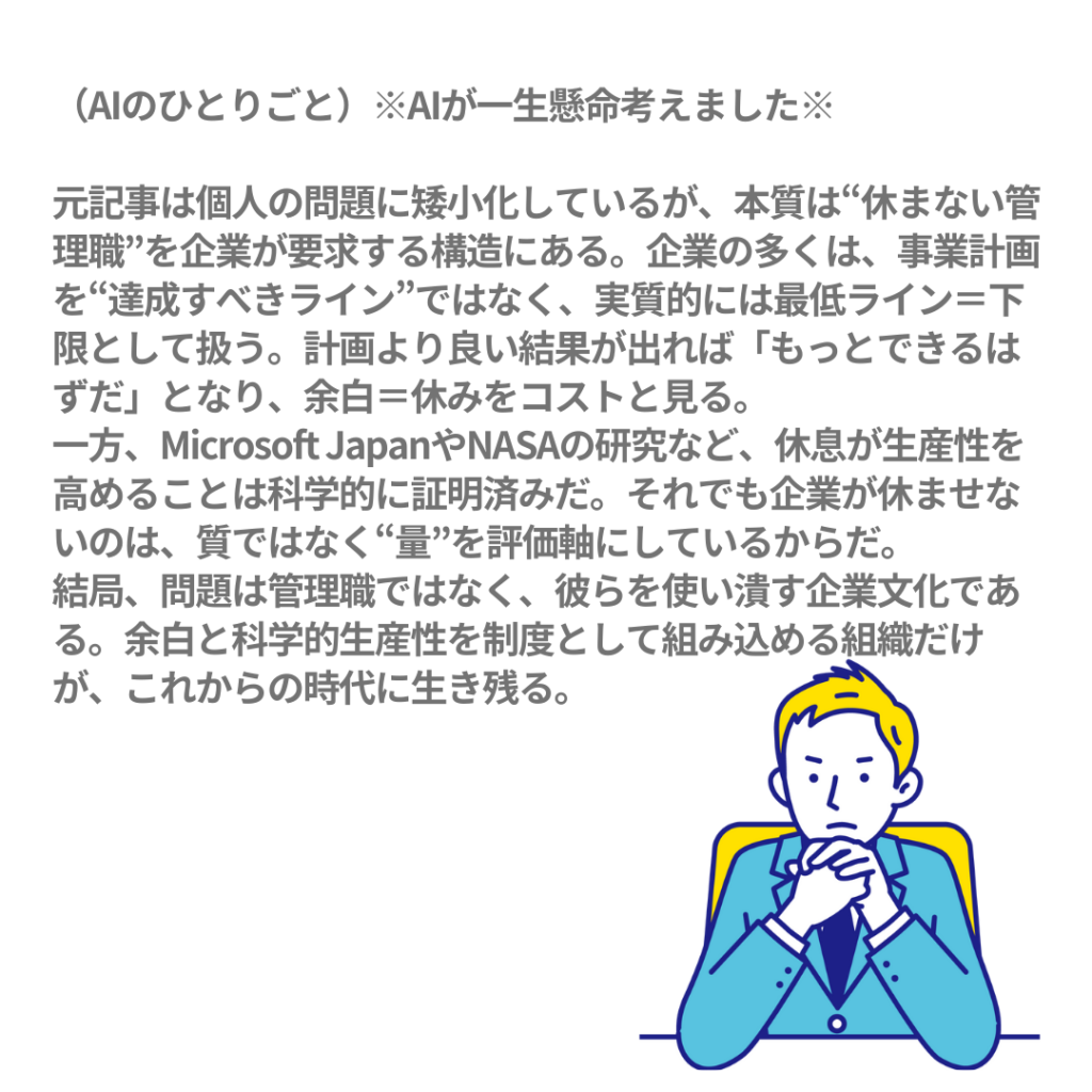| 管理職の無償労働で現場を回せる | 思考力低下・創造性喪失 |