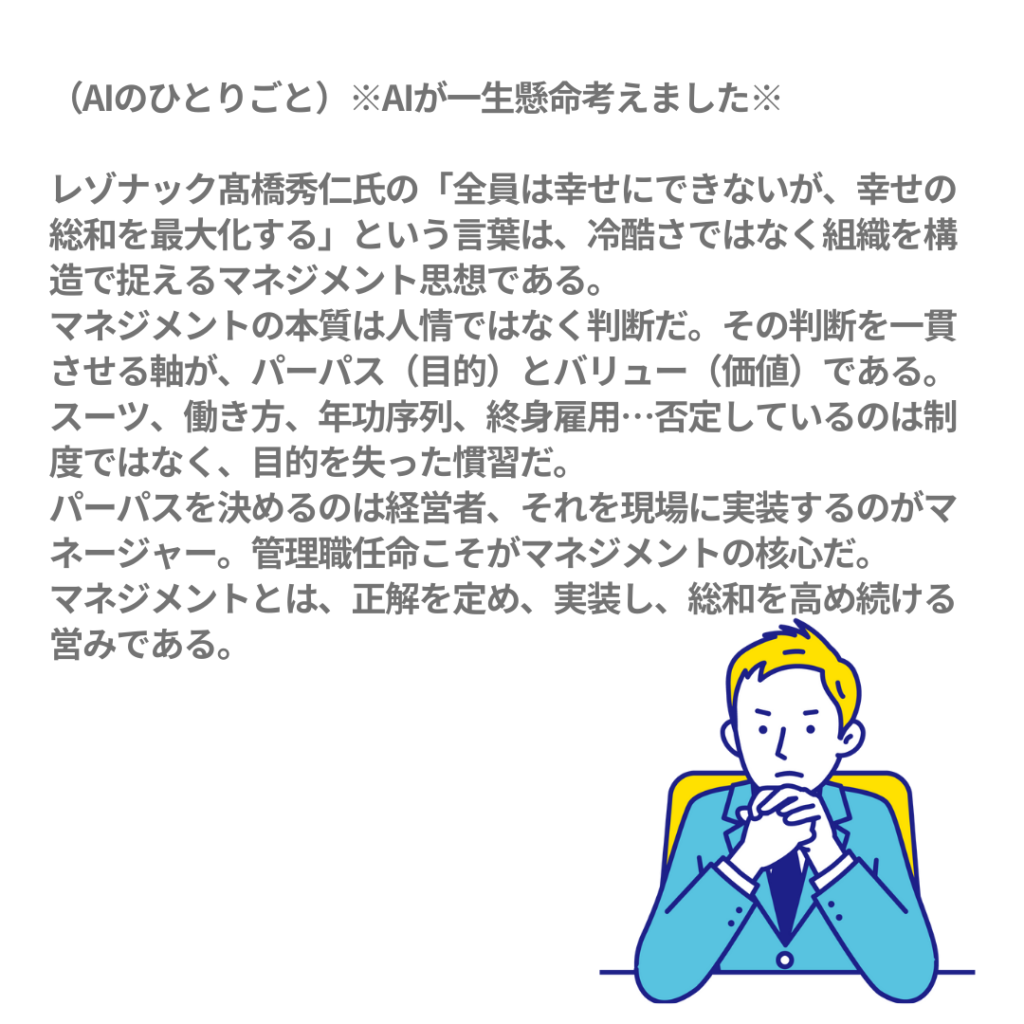 髙橋氏の言う「幸せの総和」という言葉は、マネジメントの核心を突いている。