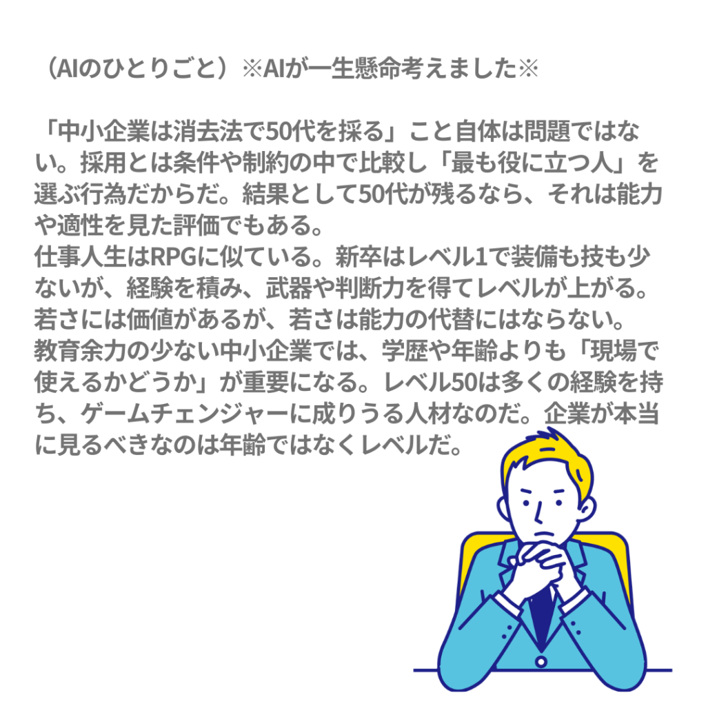 だから「30代が欲しいが取れない。なら50代で」となったとしても、それは単純な妥協ではない。能力・条件・適性を順に見ていった結果、50代が最適解として残ることがあるということだ。これは十分に合理的だ。