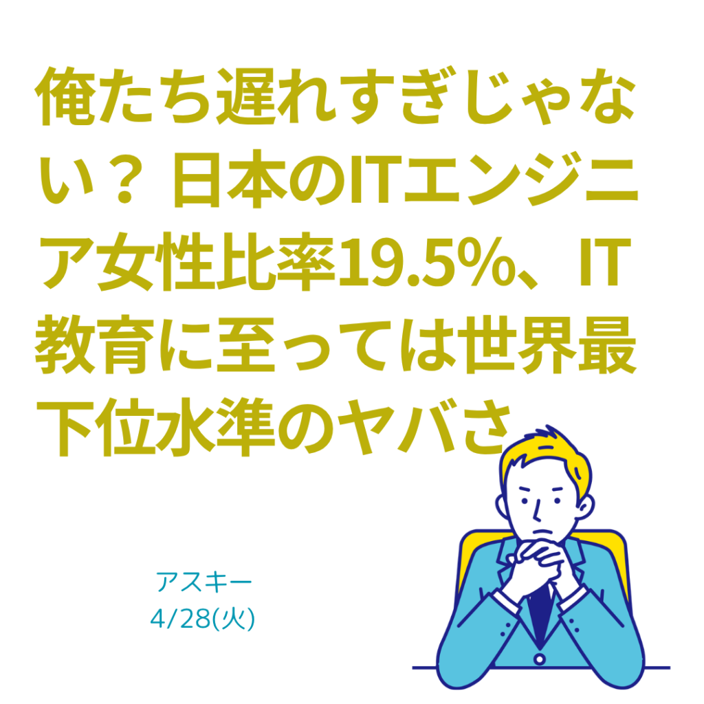 元記事:俺たち遅れすぎじゃない? 日本のITエンジニア女性比率19.5%、IT教育に至っては世界最下位水準のヤバさ(アスキー
