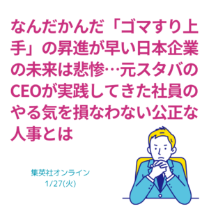 未分類 営利企業なら『経営合理性』で目を覚ませ(2026.3.3) 序章|不祥事よりも「隠蔽」が企業を壊す時代 今回の Read More » 3月 3, 2026 コメントはまだありません 未分類 中小企業はJ1チームではない|「経験者」で勝ち上がる人材戦略(2026.2.27) 序章|大企業ほどアルムナイ採用を強化している不思議 Read More » 2月 27, 2026 コメントはまだありません 未分類 無理やりな「70歳現役」設計よりも中高年フル活用を優先せよ(2026.2.17) 序章|「70歳現役」というスローガンの違和感 「7 Read More » 2月 17, 2026 コメントはまだありません 未分類 大規模言語モデルAI型のリーダーが、チームとフローを強くする(2026.2.13) 序章|「訂正できるリーダー」は“いい人”ではなく、 Read More » 2月 13, 2026 コメントはまだありません 未分類 グーグル視点の採用と、一般企業視点の採用を同一視はできない(2026.2.10) 序章|その正しさは、私たちにはまぶしすぎる 「とん Read More » 2月 10, 2026 コメントはまだありません 未分類 若者信仰の『青田創り』が日本発のイノベーションを破壊する(2026.2.6) 序章|「青田創り」は「若者信仰」言い換えに過ぎない Read More » 2月 6, 2026 コメントはまだありません 未分類 「新卒1500万円」とオリンパス子会社のジョブ型解雇は真逆だ(2026.2.3) 序章|「新卒1年目に年収1500万円」はメディアの Read More » 2月 3, 2026 コメントはまだありません 未分類 口コミ社会で「ブラック労働+搾取」を試みる度胸と愚かさ(2026.1.30) 序章|ブラック労働はもう隠し切れない 数千円の家電 Read More » 1月 30, 2026 コメントはまだありません 未分類 なぜ「ゴマすり人材」が上に行く?|人事システム設計で排除しろ(2026.1.27) 序章|なぜ「ゴマすり人材」が上にいるのか どの会社 Read More » 1月 27, 2026 コメントはまだありません 未分類 アイデアレスのコンビニは要らない|人手不足を“省人ビジネス”に(2023.1.23) 序章|アイデアレスのコンビニなら要らない 「排外主 Read More » 1月 23, 2026 コメントはまだありません ページ1 ページ2 ページ3 ページ4 ページ5